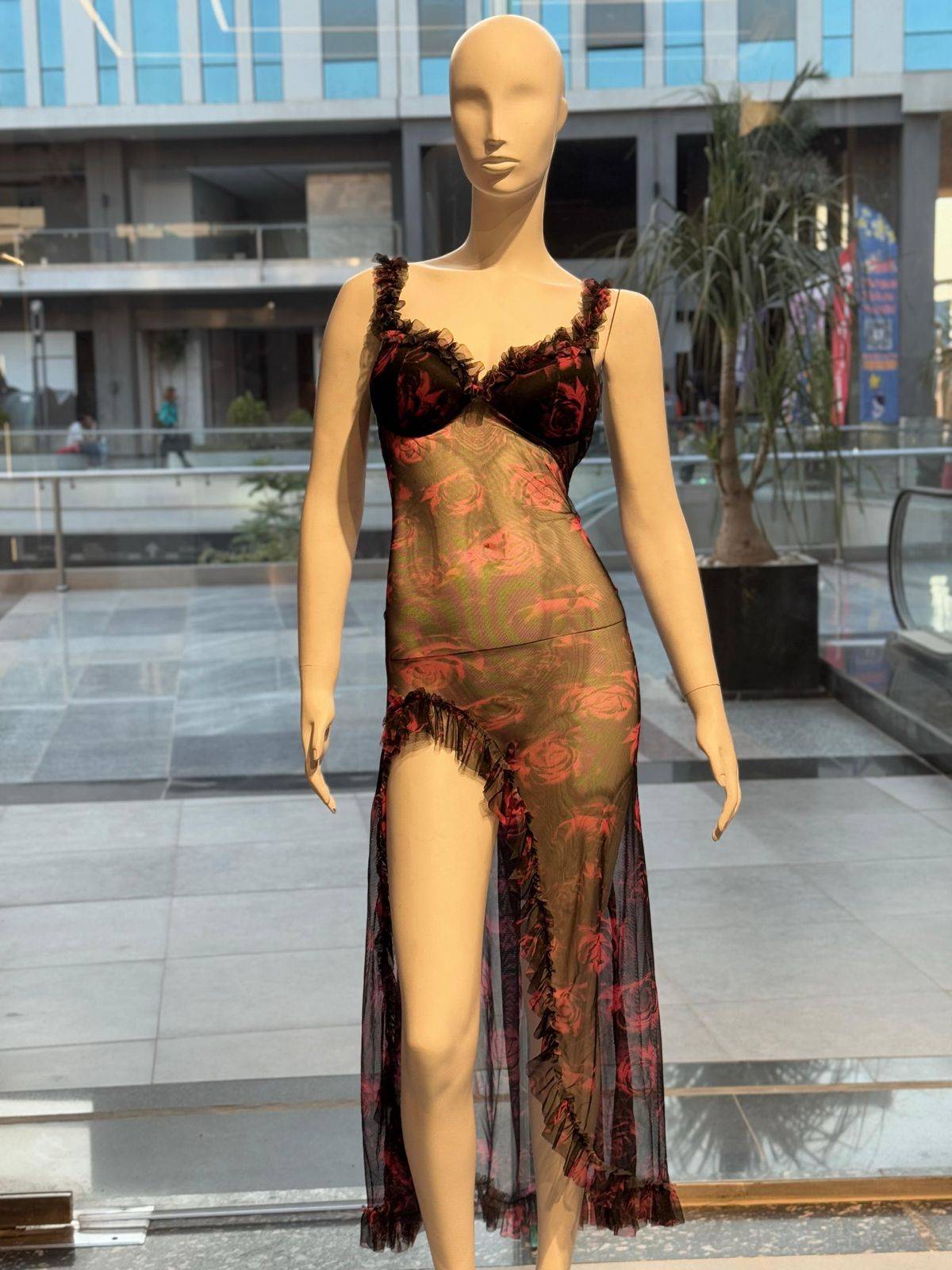 Turn heads with this enchanting sheer tulle nightdress, delicately adorned with romantic rose prints and soft ruffle trims. Crafted from lightweight tulle that drapes beautifully on the body, it’s designed to flatter figures from 65 to 90 kg, blending elegance with confident allure.